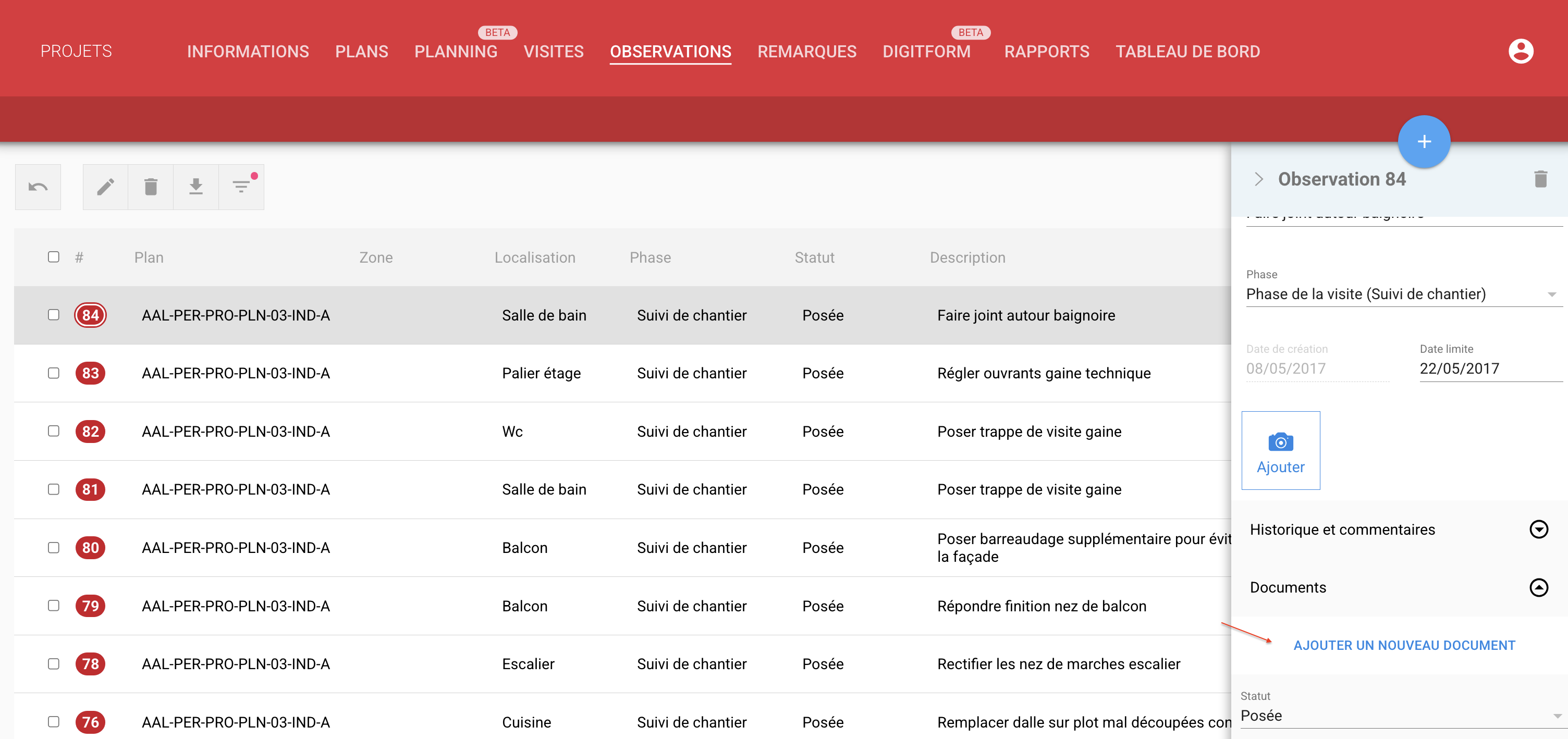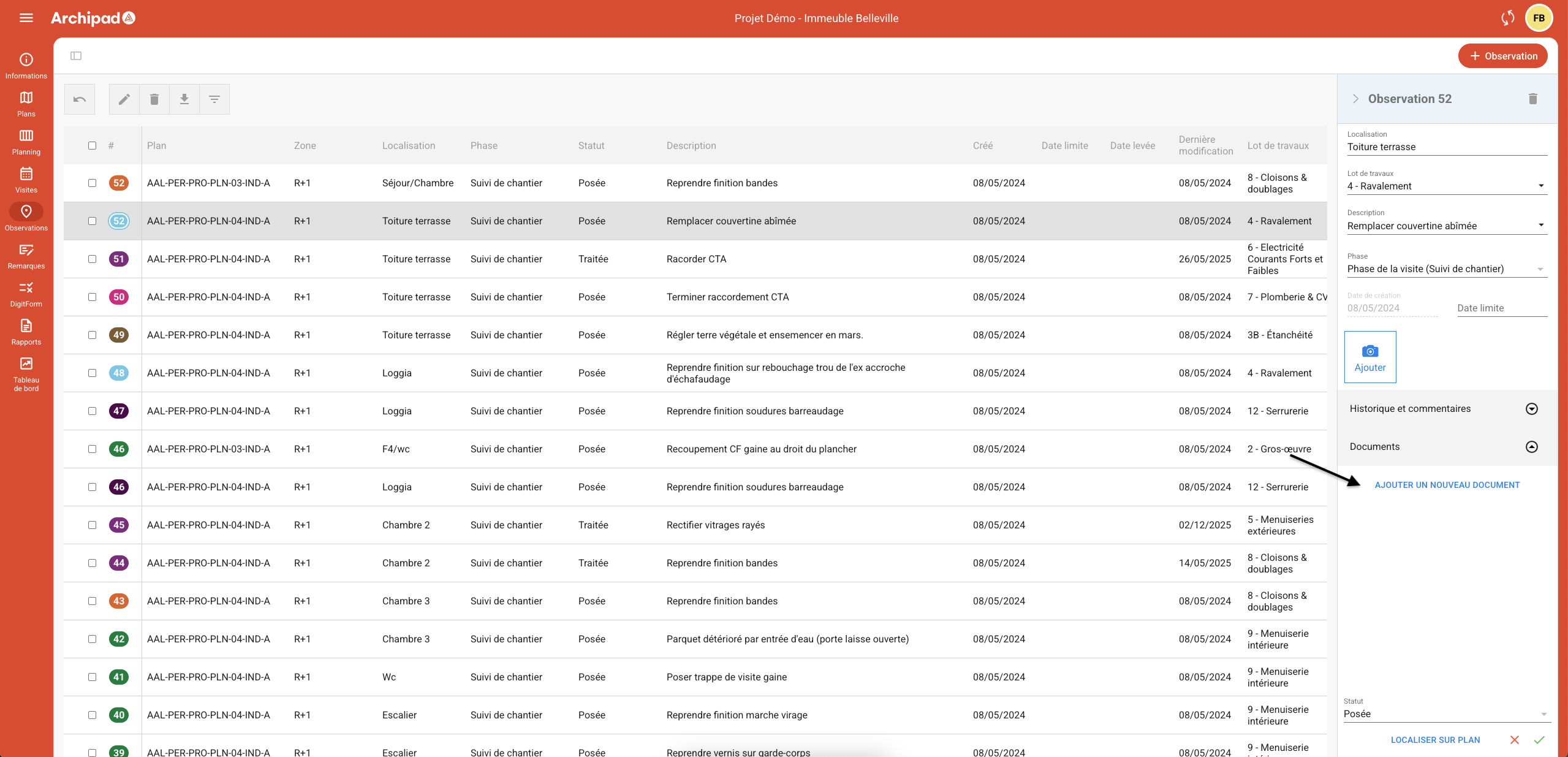Dans Archipad Cloud, vous pouvez facilement associer des documents à une observation pour enrichir les informations liées à un point spécifique. Voici comment procéder :