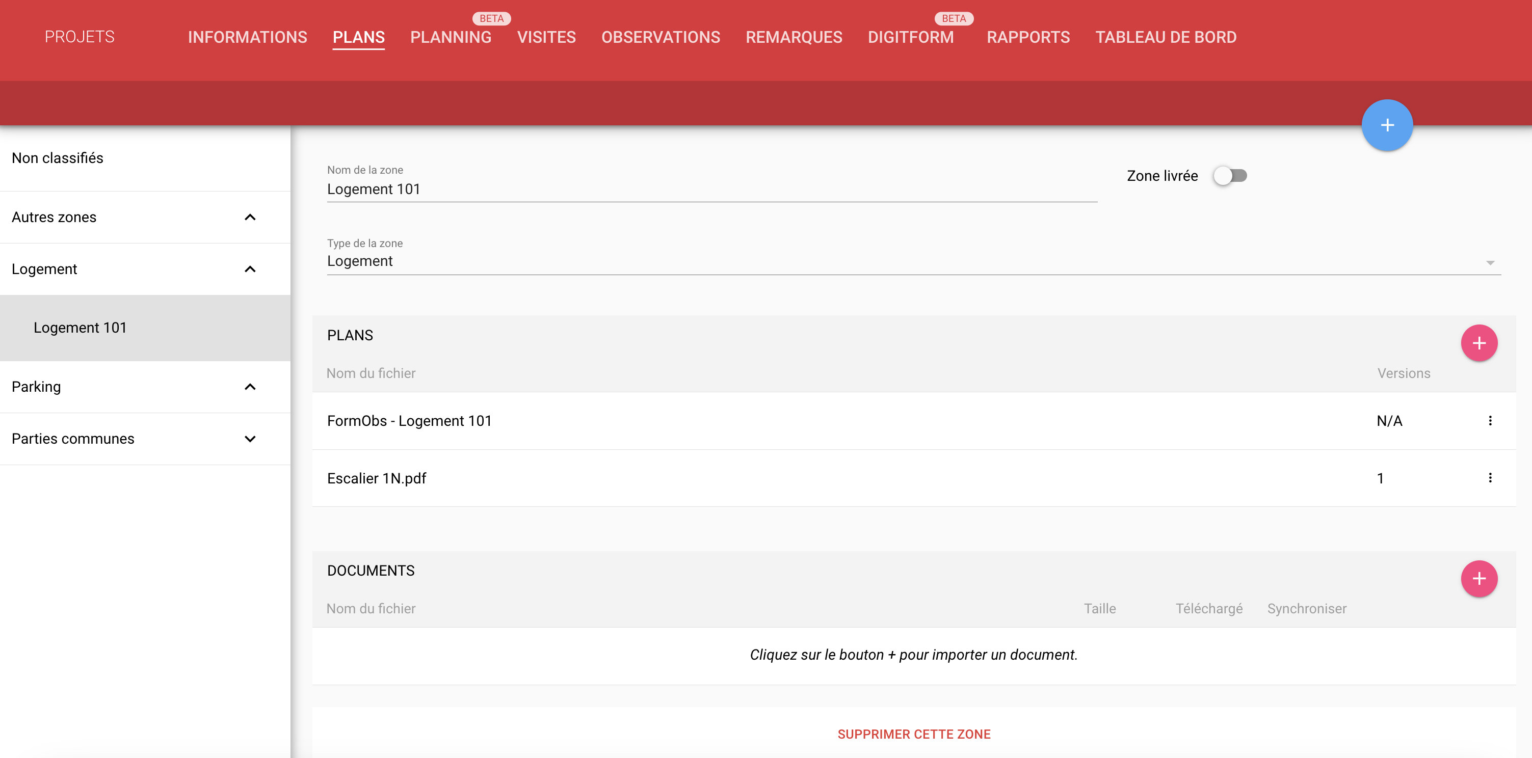Les informations aux zones sont disponibles dans le menu Plans. Les fonctionnalités liées aux zones sont essentielles pour organiser et suivre efficacement les différentes parties d'un projet de construction.