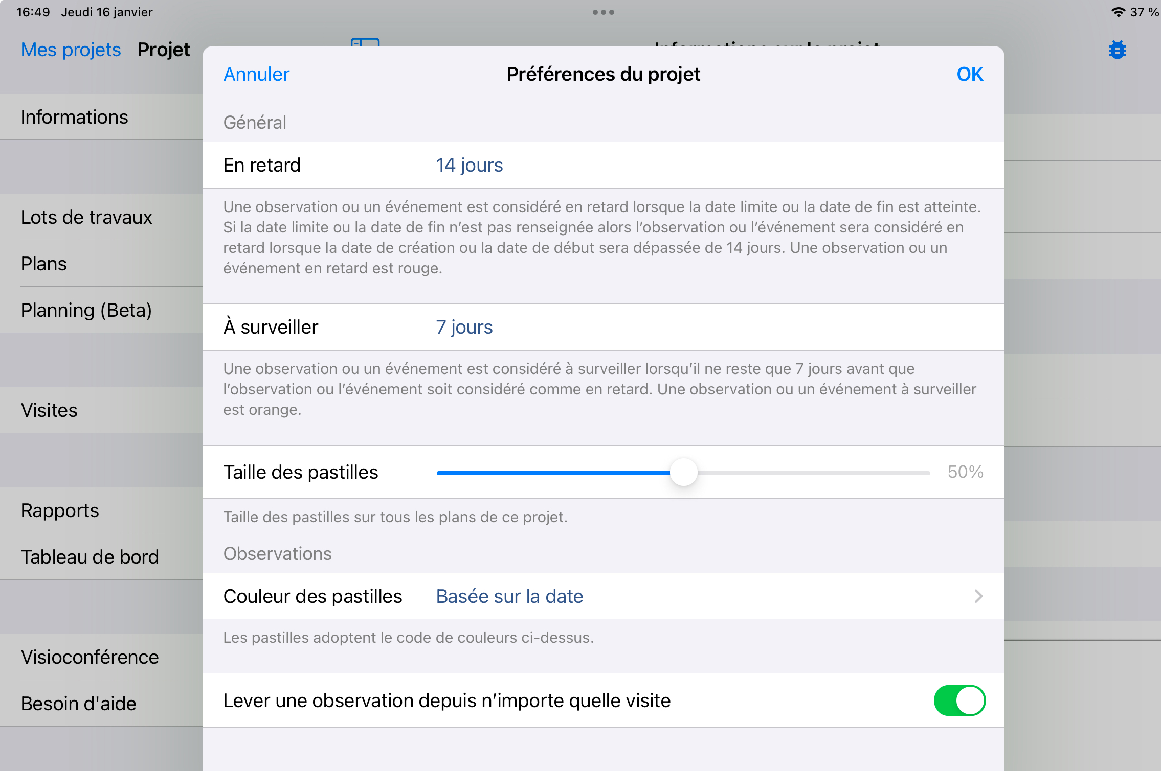 Activez ou désactivez le switch "Lever une observation depuis n’importe quelle visite" selon vos besoins.