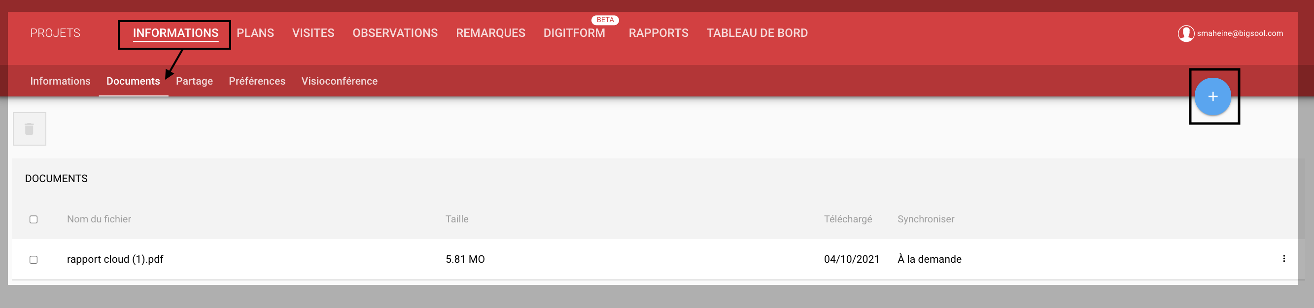 Pour inclure des documents attachés au projet, il vous suffit de naviguer sur l'écran “informations” et de sélectionner l’onglets Documents .