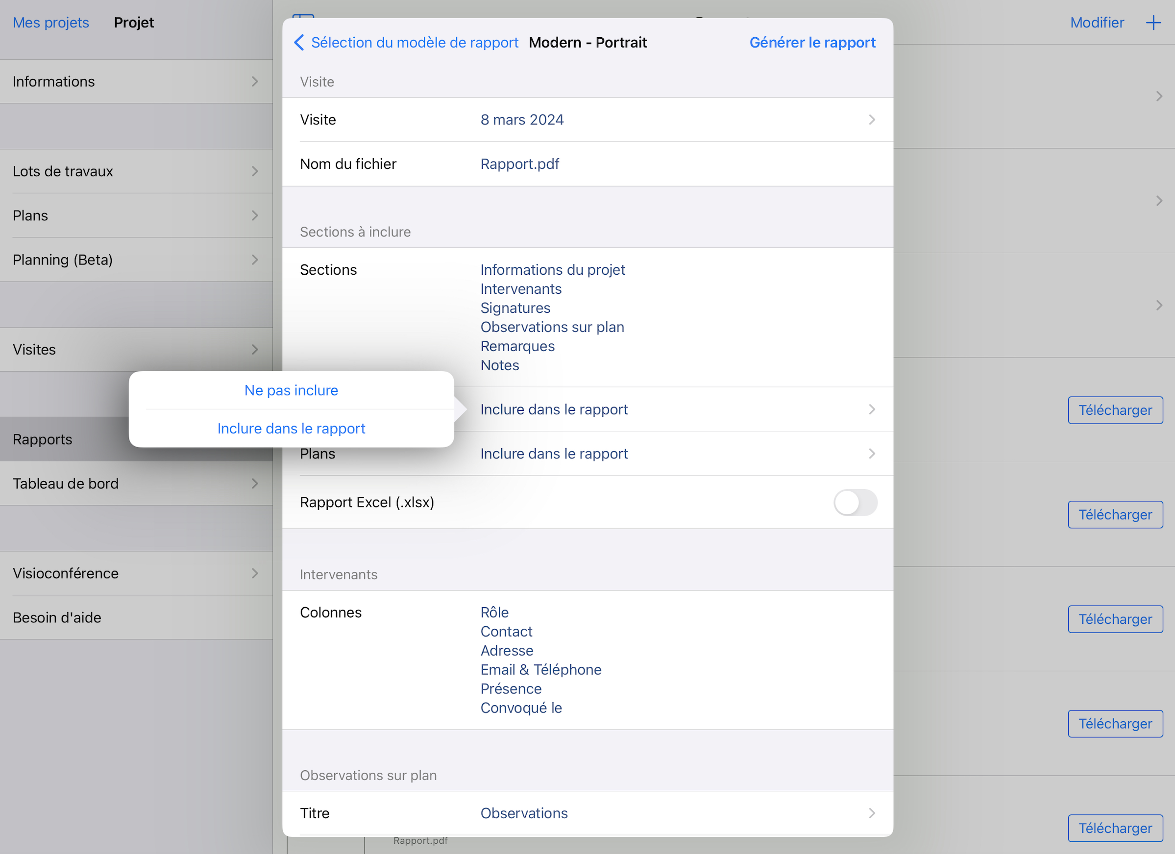 Dans Sections à inclure, activez l'option "Inclure dans le rapport" pour le Planning.