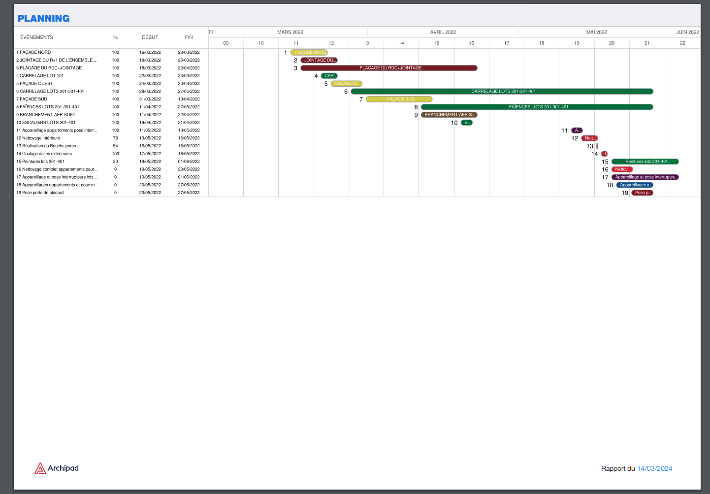 Cette fonctionnalité vous permet d'afficher le diagramme de Gantt de votre planning dans vos rapports, disponible sur Archipad App et Archipad Web.