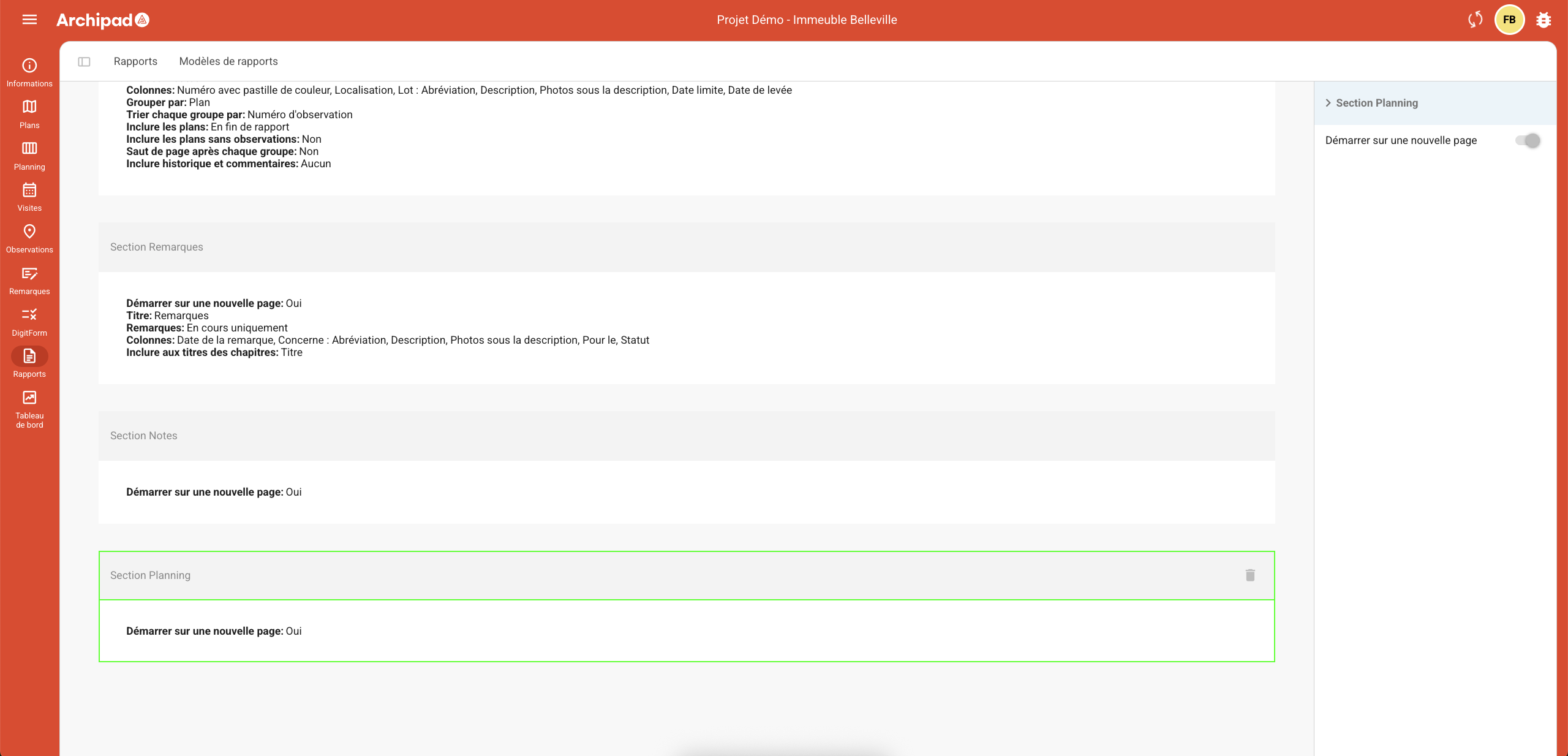 Pour générer un rapport avec la section Planning sur Archipad Cloud :