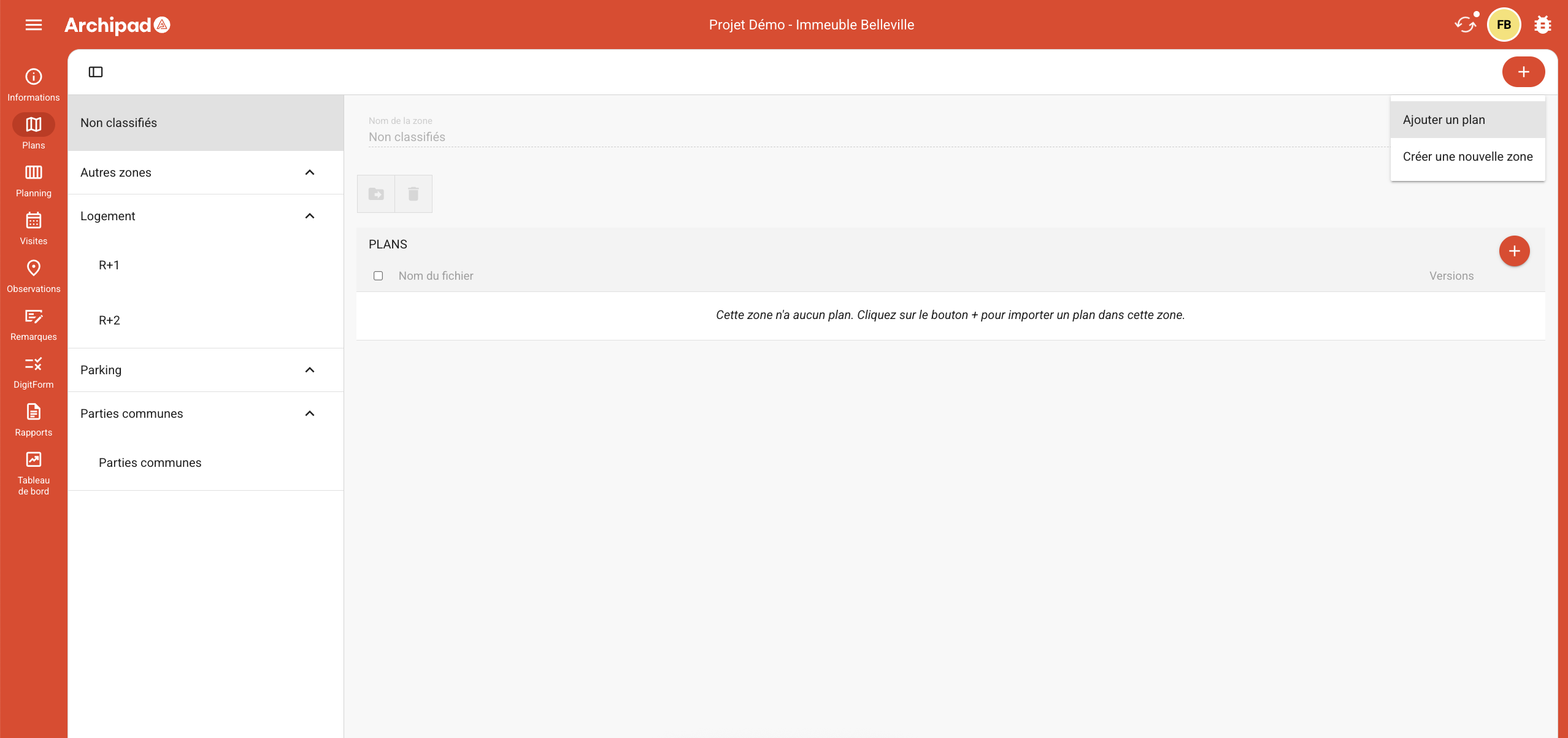 Les plans importés sont répertoriés dans la section "Plans" selon la zone choisie :