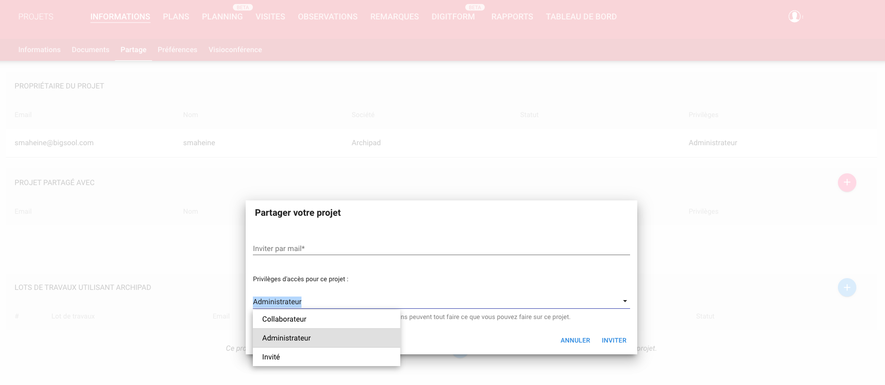 Collaborateur chantier : Il peut accéder et modifier les visites de chantier, uniquement sur Archipad App. Il ne peut pas modifier les informations du projet. Il n’a pas accès à Archipad Cloud.