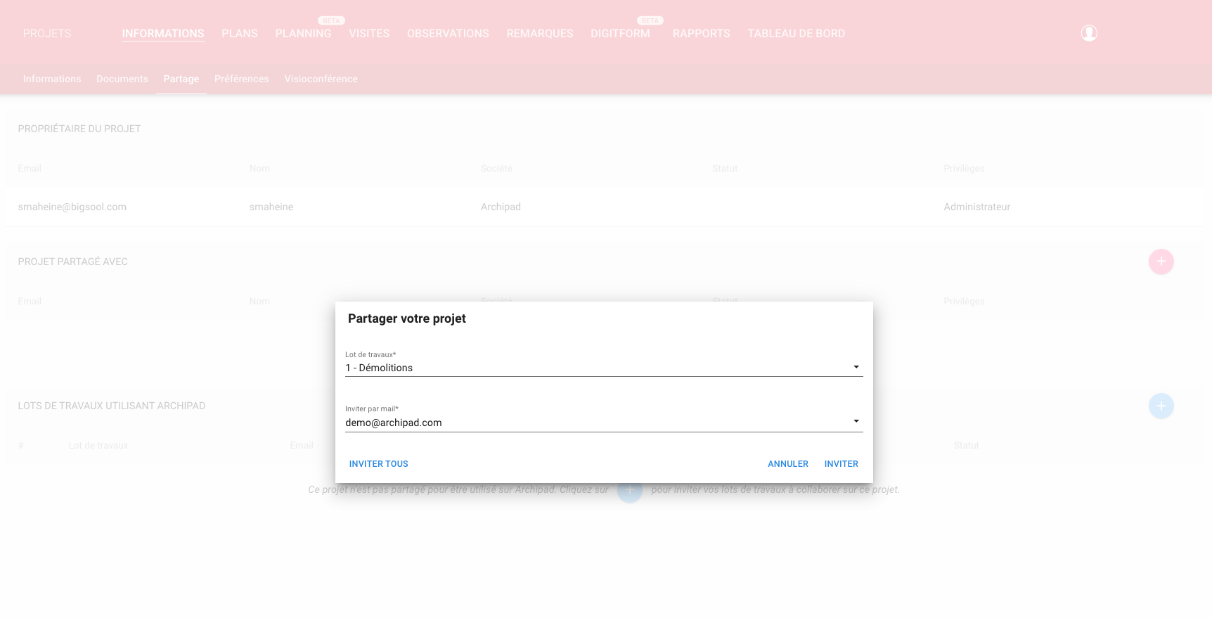 Sélectionnez le lot de travaux dans la liste déroulante. Le champ “inviter par mail” sera automatiquement pré-rempli si l’adresse email a été renseignée au préalable dans la section “lots de travaux” de la page INFORMATIONS