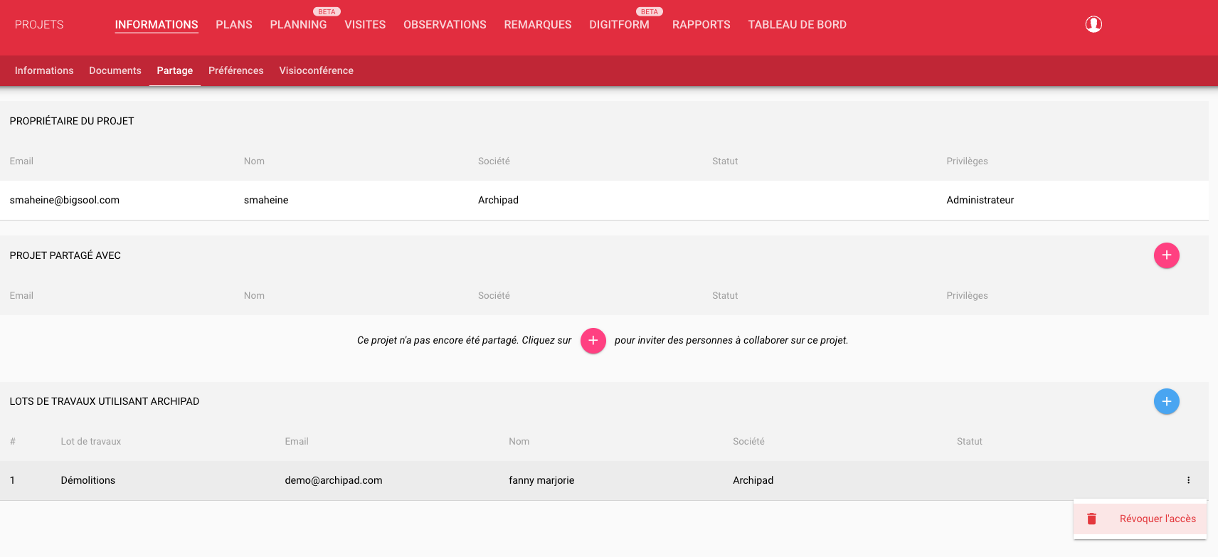 Maître d’ouvrage : Il peut seulement consulter les informations dans le projet. Ne voit pas les visites de chantier. Ne peut rien modifier.