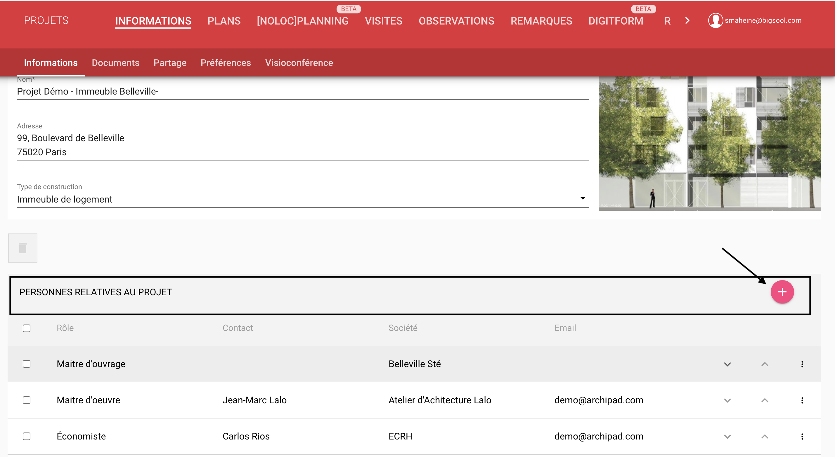 Pour ajouter une personne relative au projet, il vous suffit de cliquer sur le bouton + rose situé dans la section personnes relatives au projet.