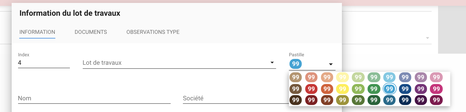 Pour choisir manuellement la couleur des pastilles par lots de travaux, sélectionnez l'option "Par lots de travaux". Vous devez d'abord définir la couleur des pastilles pour chaque lot sur la page dédiée aux lots de travaux (Écran Informations).