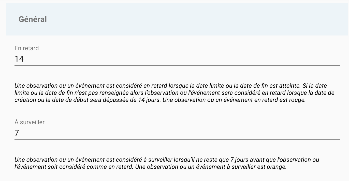 Si la date limite ou de fin n'est pas spécifiée, l'observation ou l'événement sera en retard lorsque la date de création ou de début dépasse le nombre de jours indiqué.