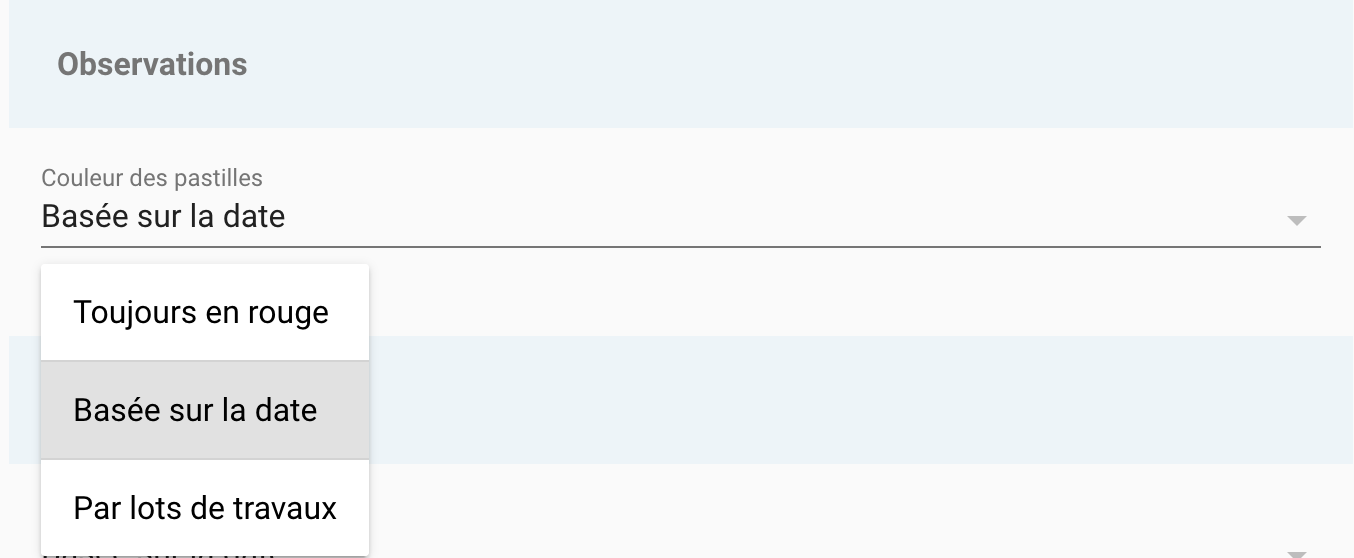 Vous avez la possibilité de personnaliser la couleur des pastilles de vos observations en fonction de trois critères : Toujours en rouge, Basée sur la date, ou Par lots de travaux.