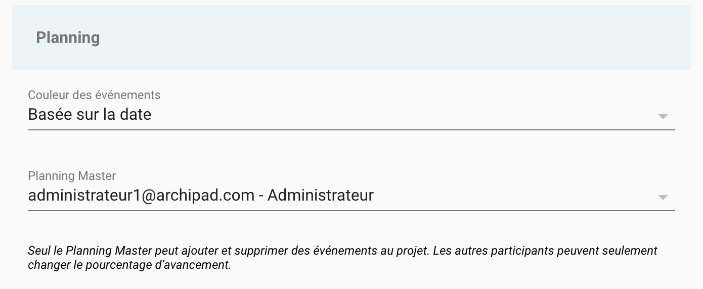Vous pouvez désigner un collaborateur comme "Planning Master". Cette fonction lui confère la gestion autonome du planning du projet. Seul le Planning Master peut ajouter ou supprimer des événements. Les autres participants peuvent uniquement modifier le pourcentage d'avancement.