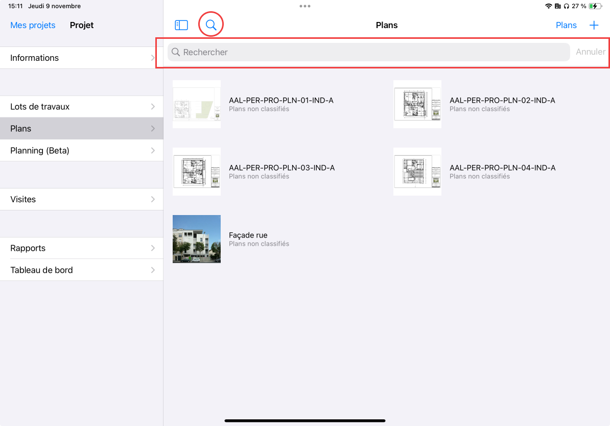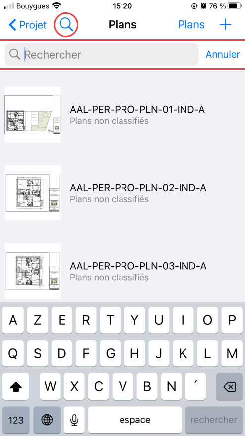 Sur l'écran des "Plans", appuyez sur l'icône de la loupe pour ouvrir la barre de recherche. Ensuite, saisissez le nom du plan que vous recherchez.