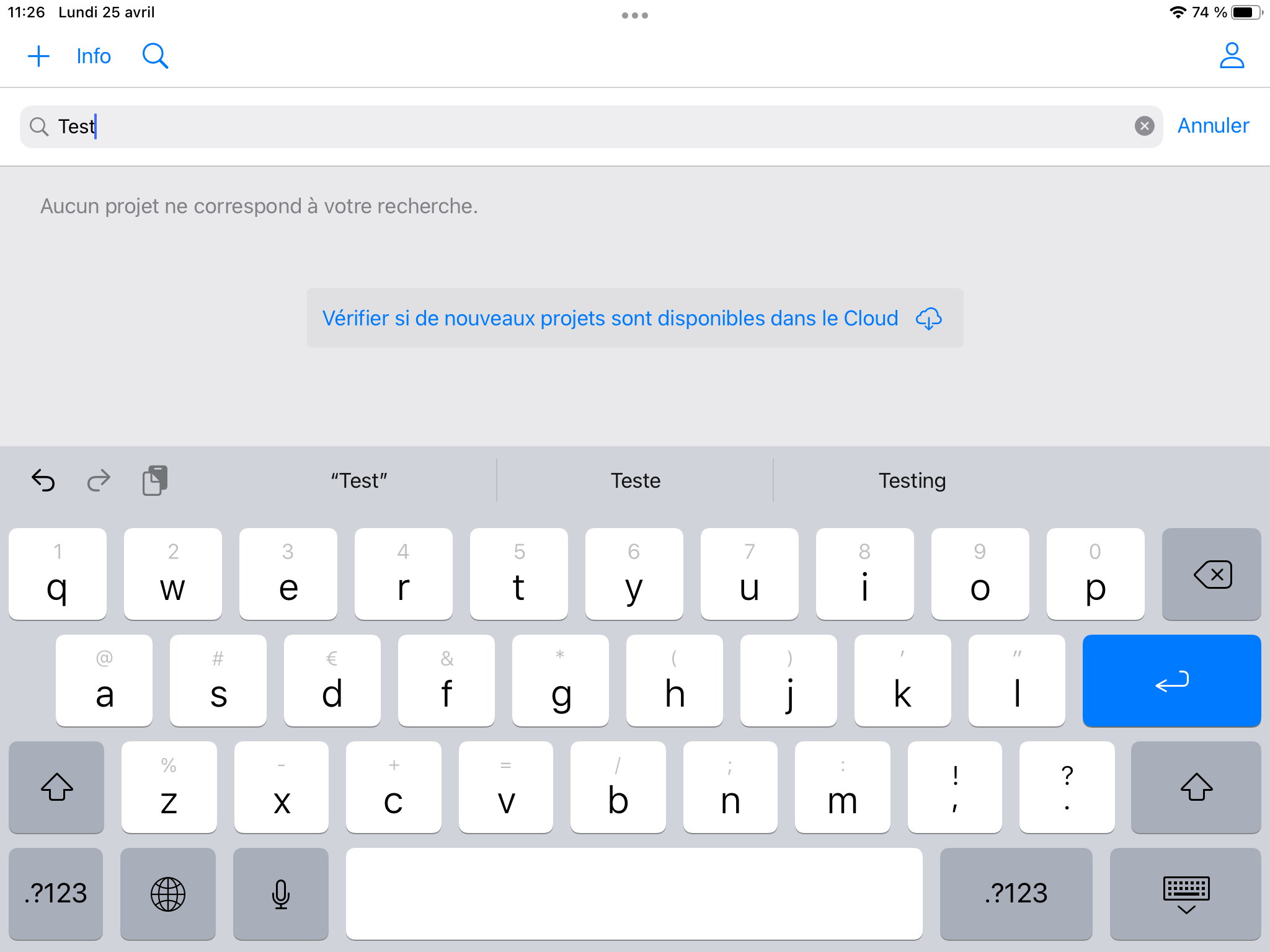Pour garantir la présence de tous vos projets sur votre tablette, il vous suffit de cliquer sur le bouton “Vérifier si de nouveaux projets sont disponibles dans le Cloud”, situé au bas de l'écran.