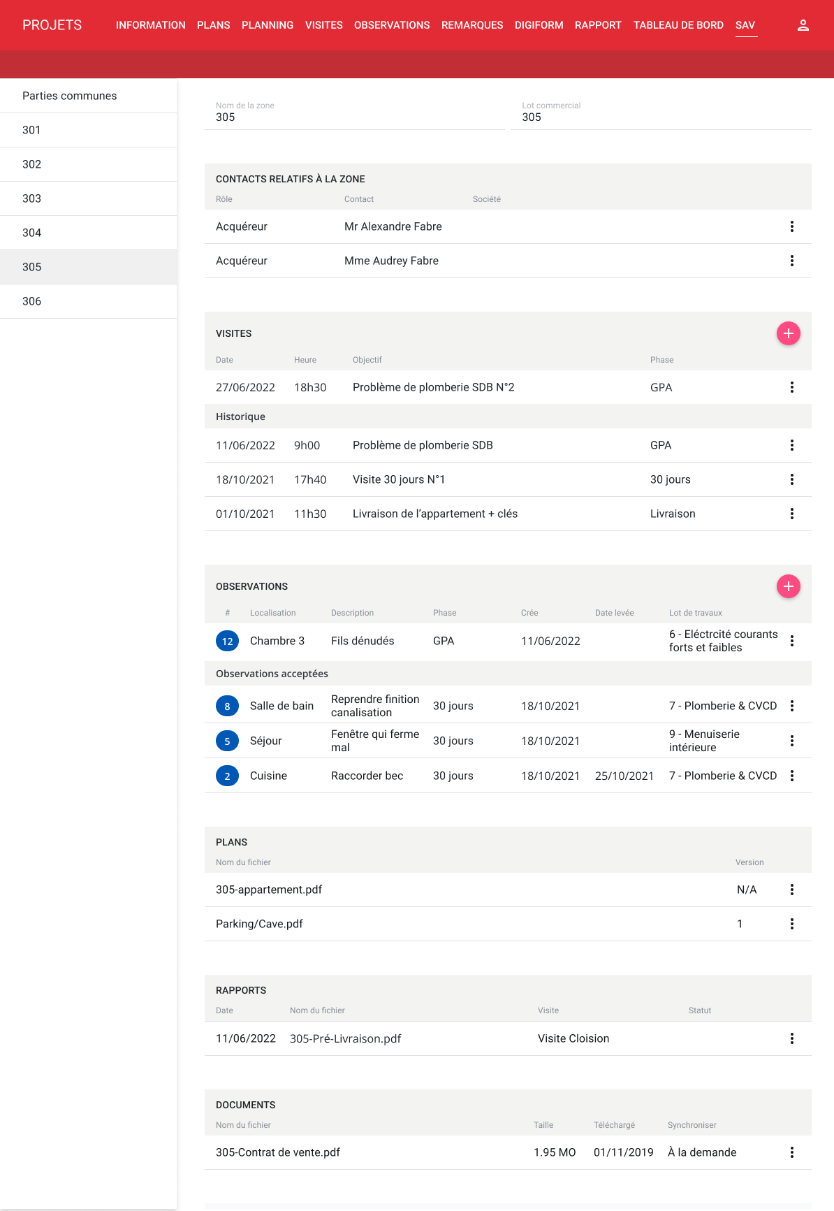 Visites : La section "Visites" vous permet de planifier les interventions nécessaires pour résoudre les problèmes identifiés lors des différentes phases gérées par les équipes de Service Après-Vente (SAV). Elle offre également une vue d'ensemble des visites passées et à venir.