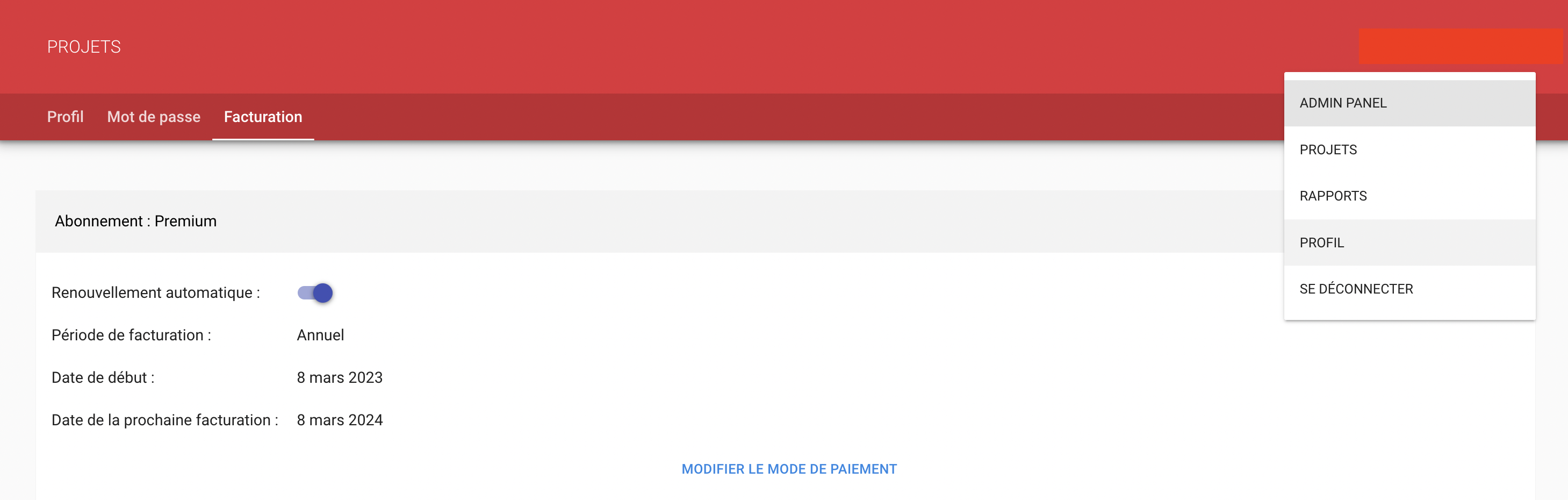 Si le switch de la ligne Renouvellement automatique est actif :