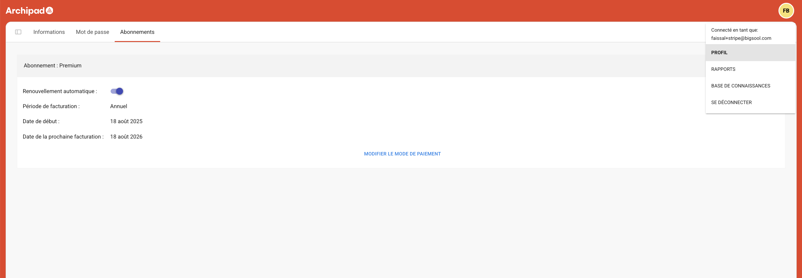 Seuls les abonnements Premium souscrits auprès du service commercial auront la possibilité de suspendre ou d'activer le renouvellement automatique de l’abonnement depuis Archipad Cloud.
