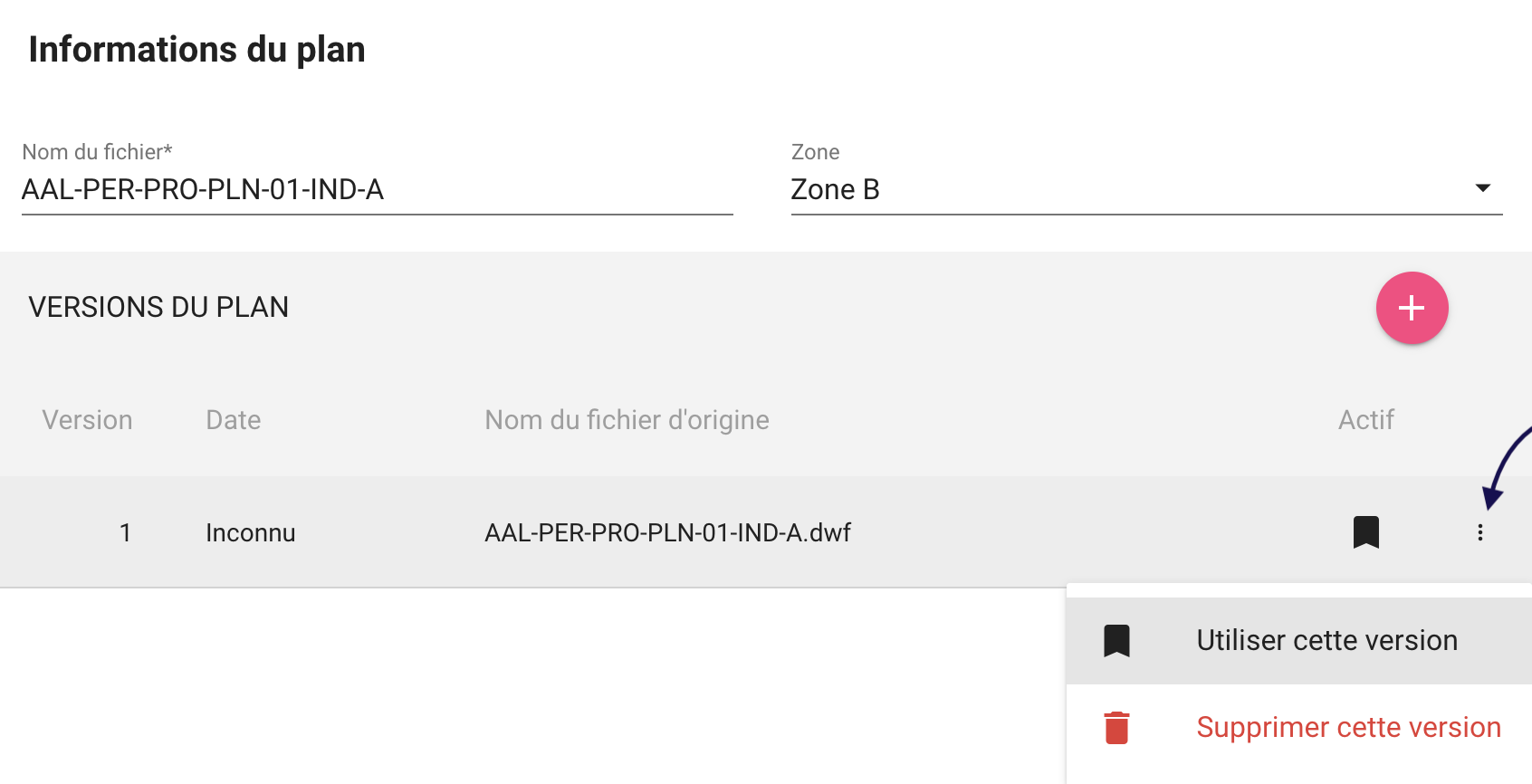 Utiliser cette version | Permet de rendre le plan actif, il sera identifié par un drapeau noir visible dans la colonne Actif. |