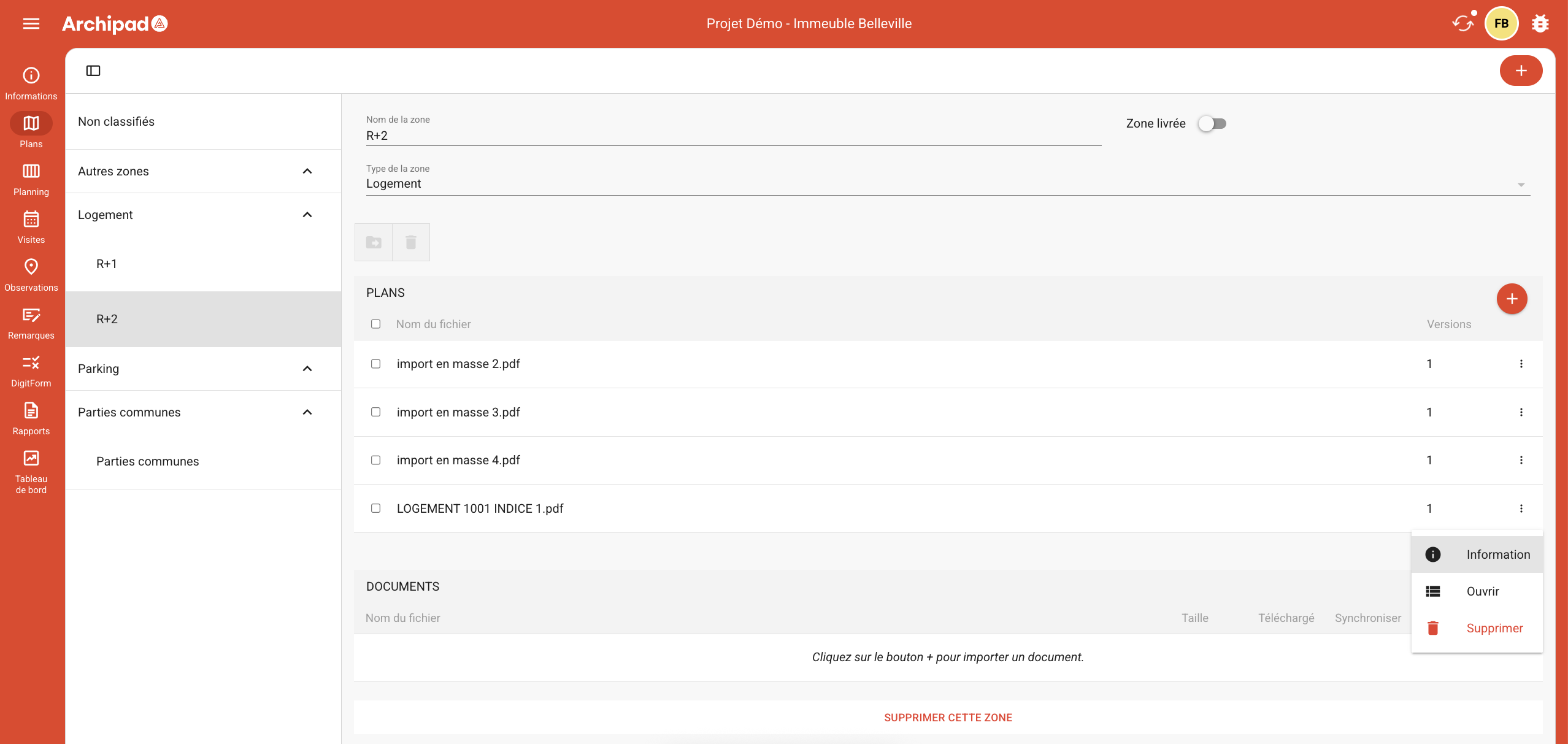 Le champ zone contient un sélecteur avec les zones existantes dans le projet : Zone non classifié et Zone classifié, ce qui vous permettra de déplacer le plan d’une zone à une autre.