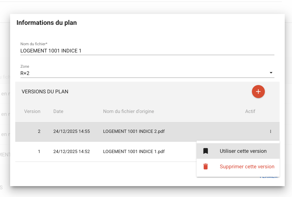 Supprimer cette version | Permet de supprimer la version du plan présent dans la liste. |