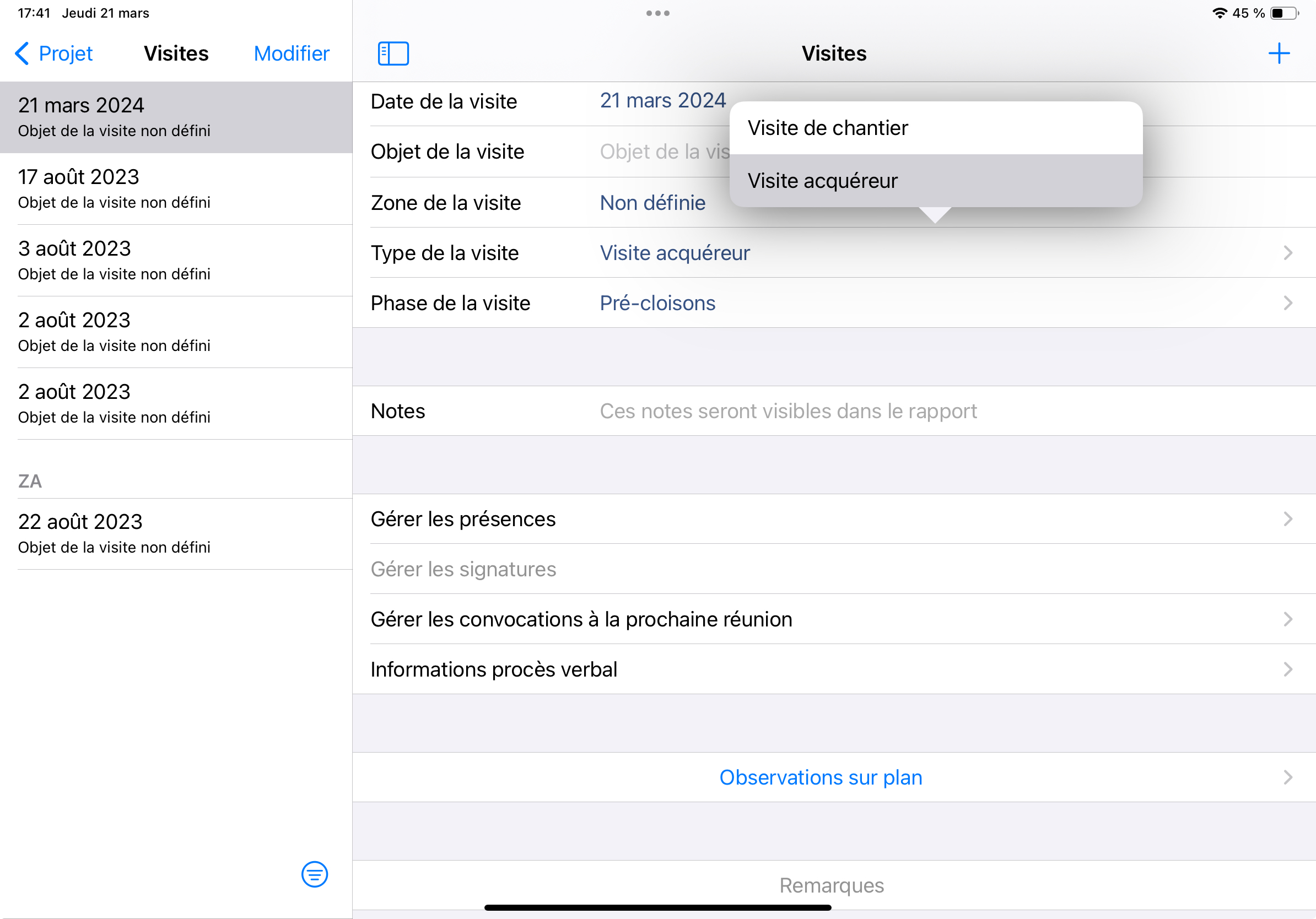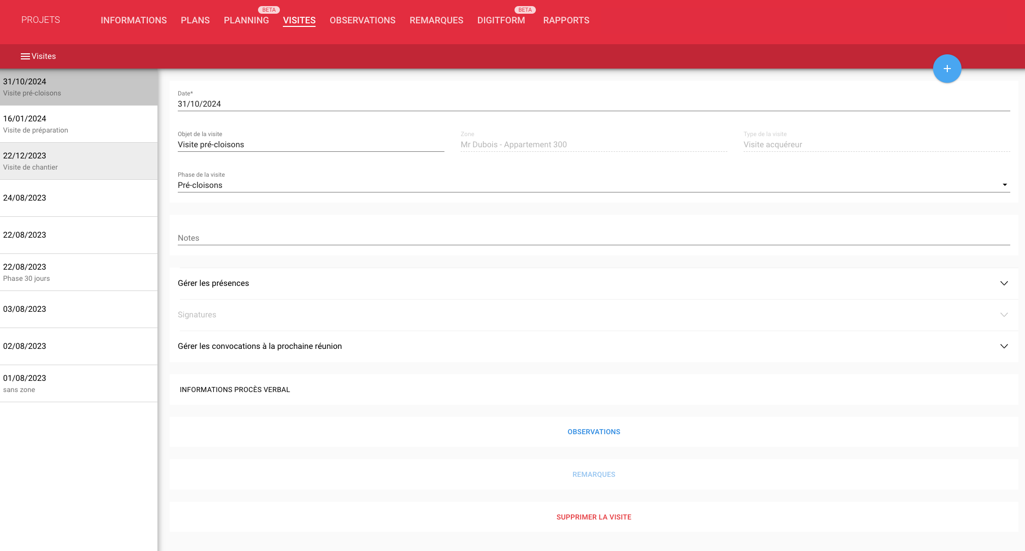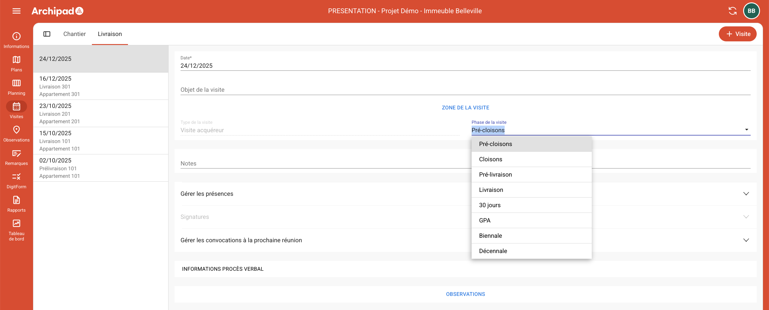 Par défaut, la phase indiquée lors de la création d’une visite acquéreur est Pré-cloisons. Un responsable clientèle a accès aux visites acquéreur uniquement sur Archipad App.