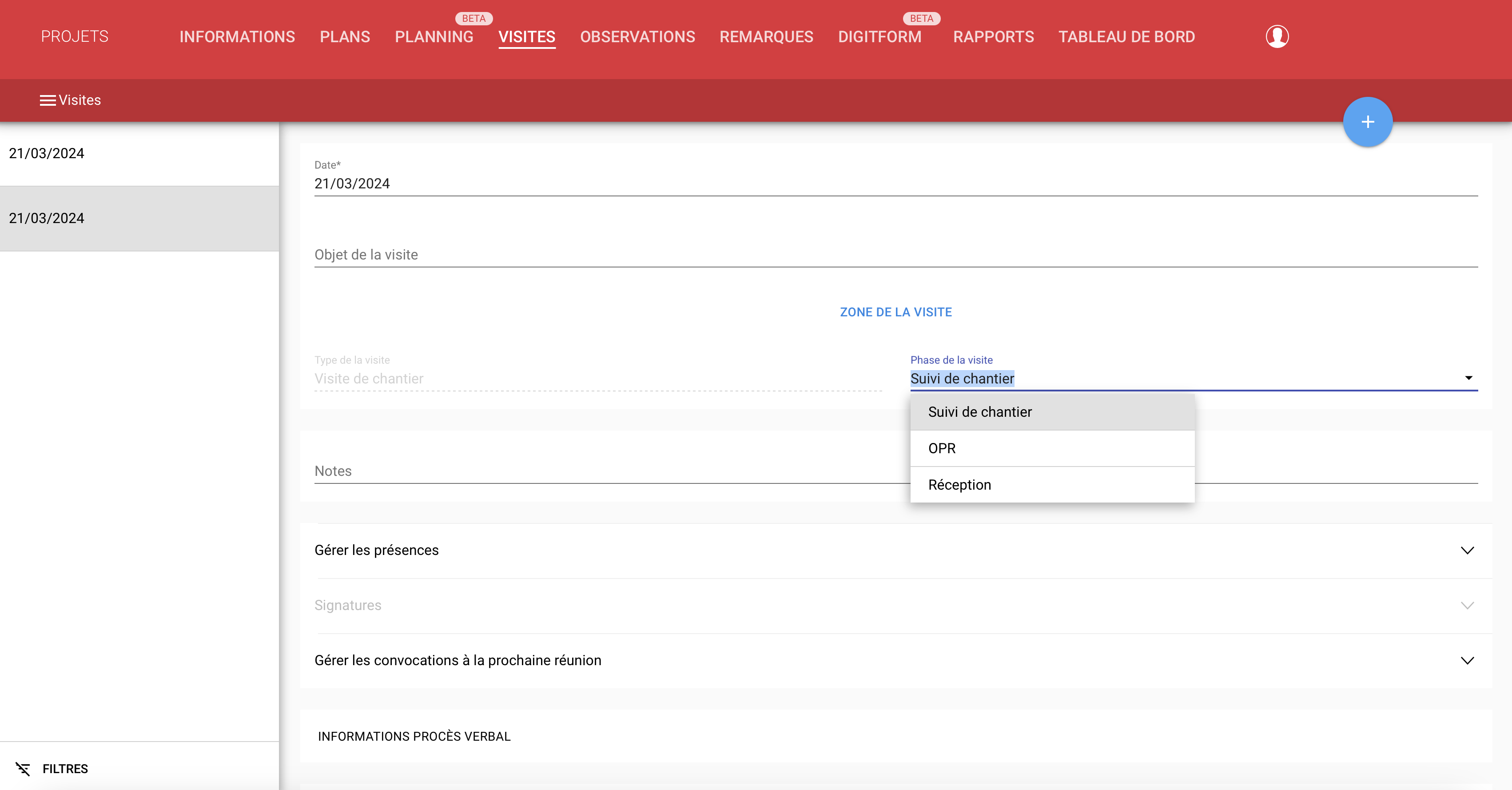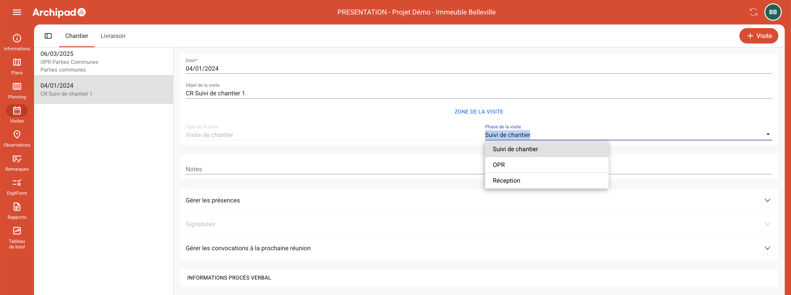 Lors de la création d’une visite de chantier, la phase par défaut est 'Suivi de chantier'.