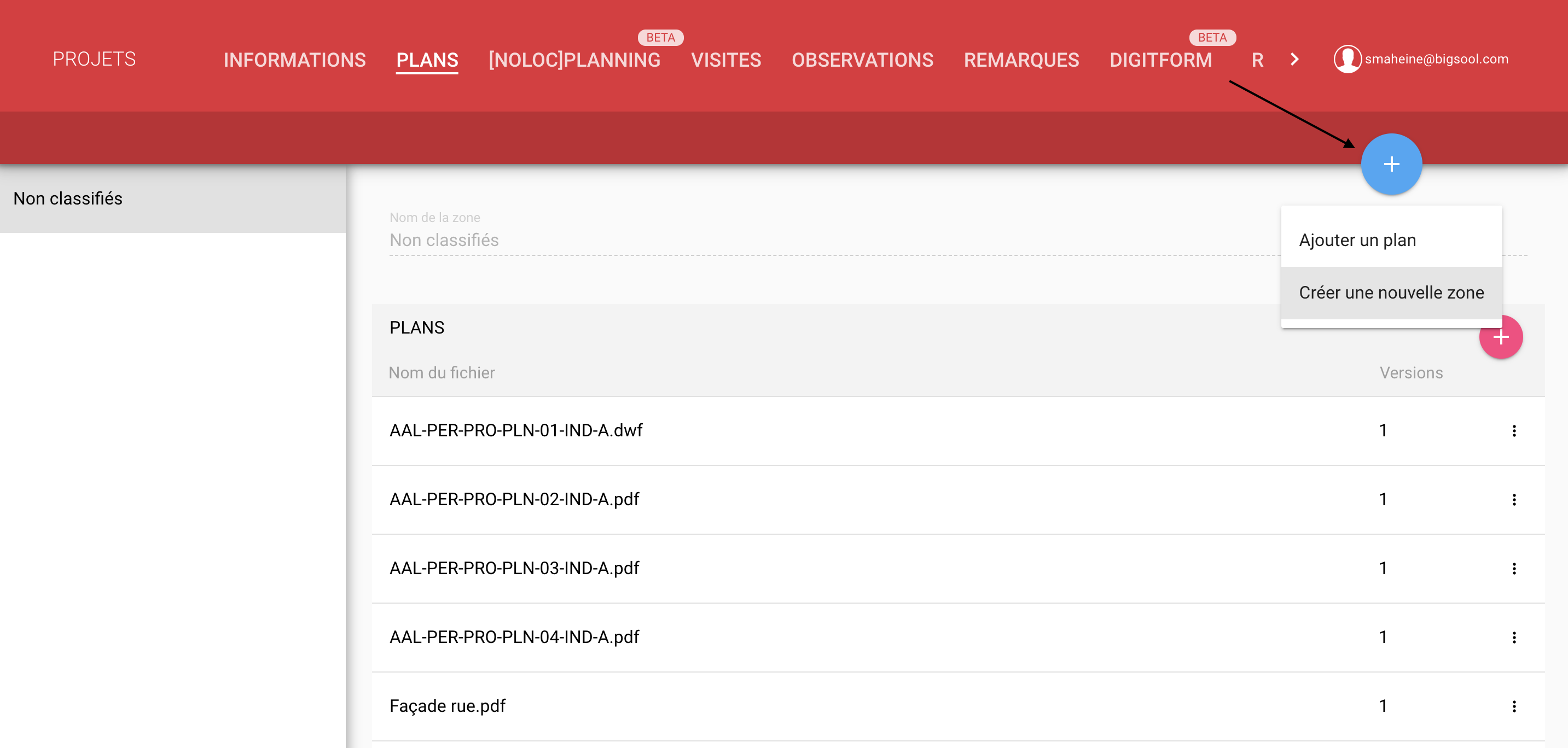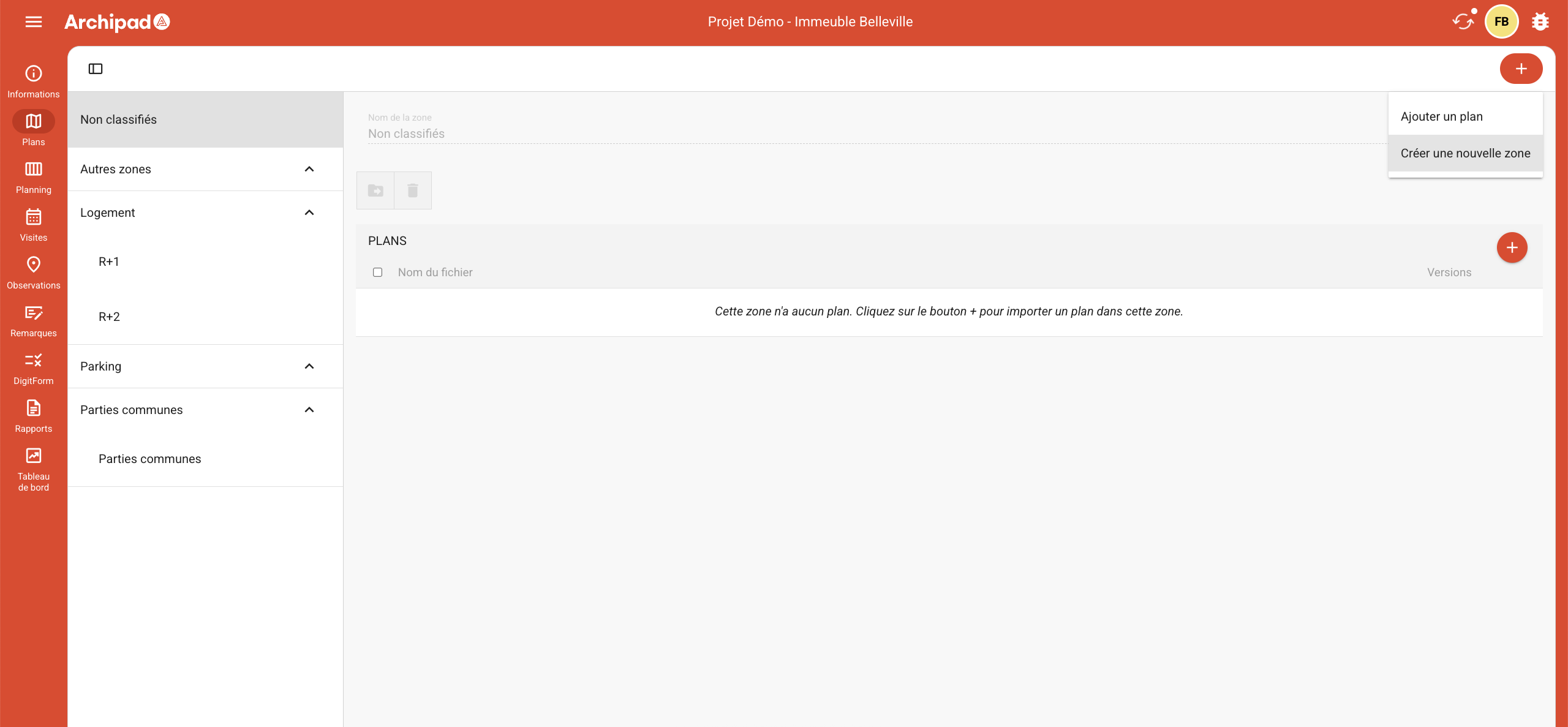 Un menu affiche : "Ajouter un plan" et "Créer une nouvelle zone".