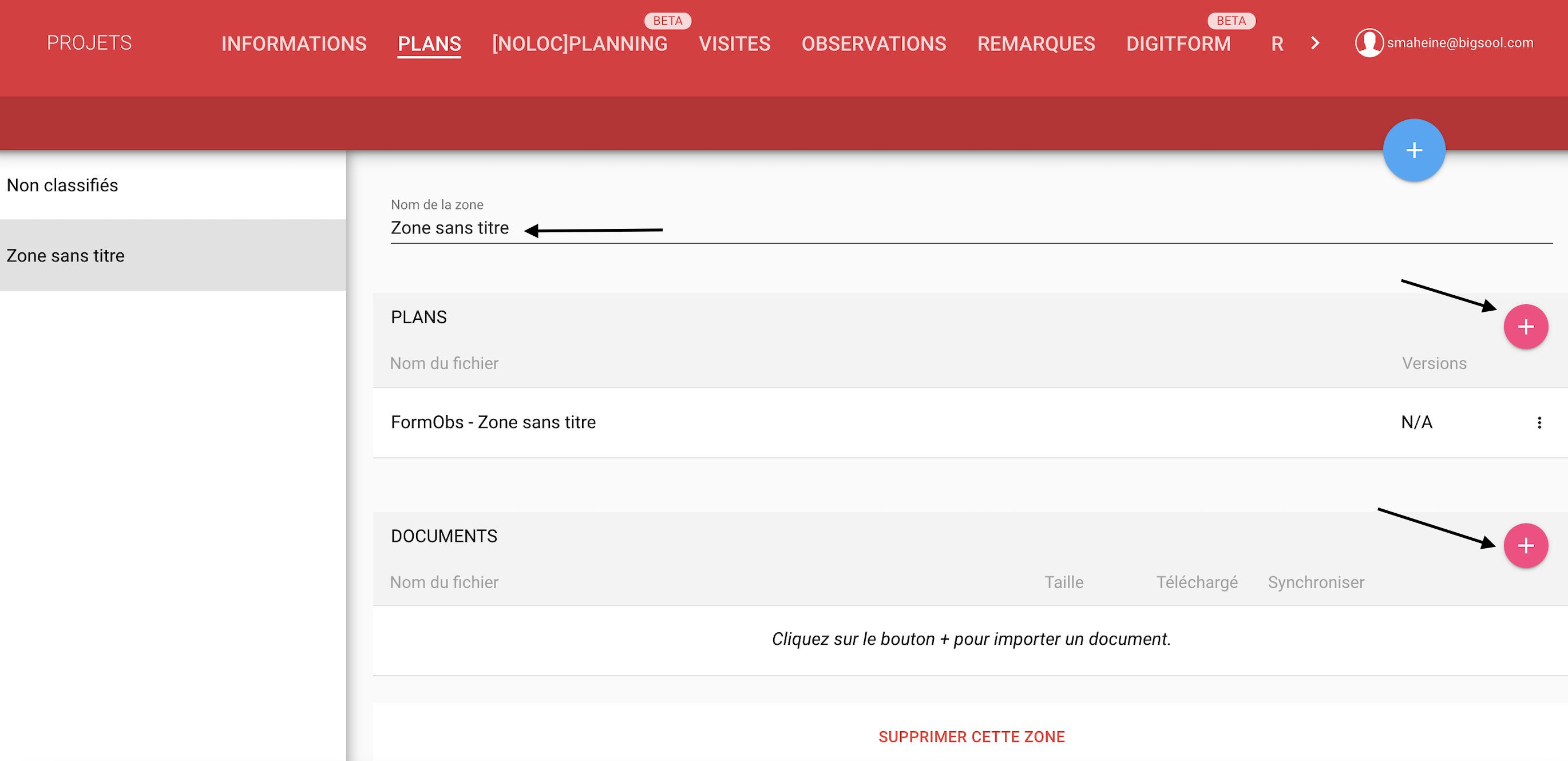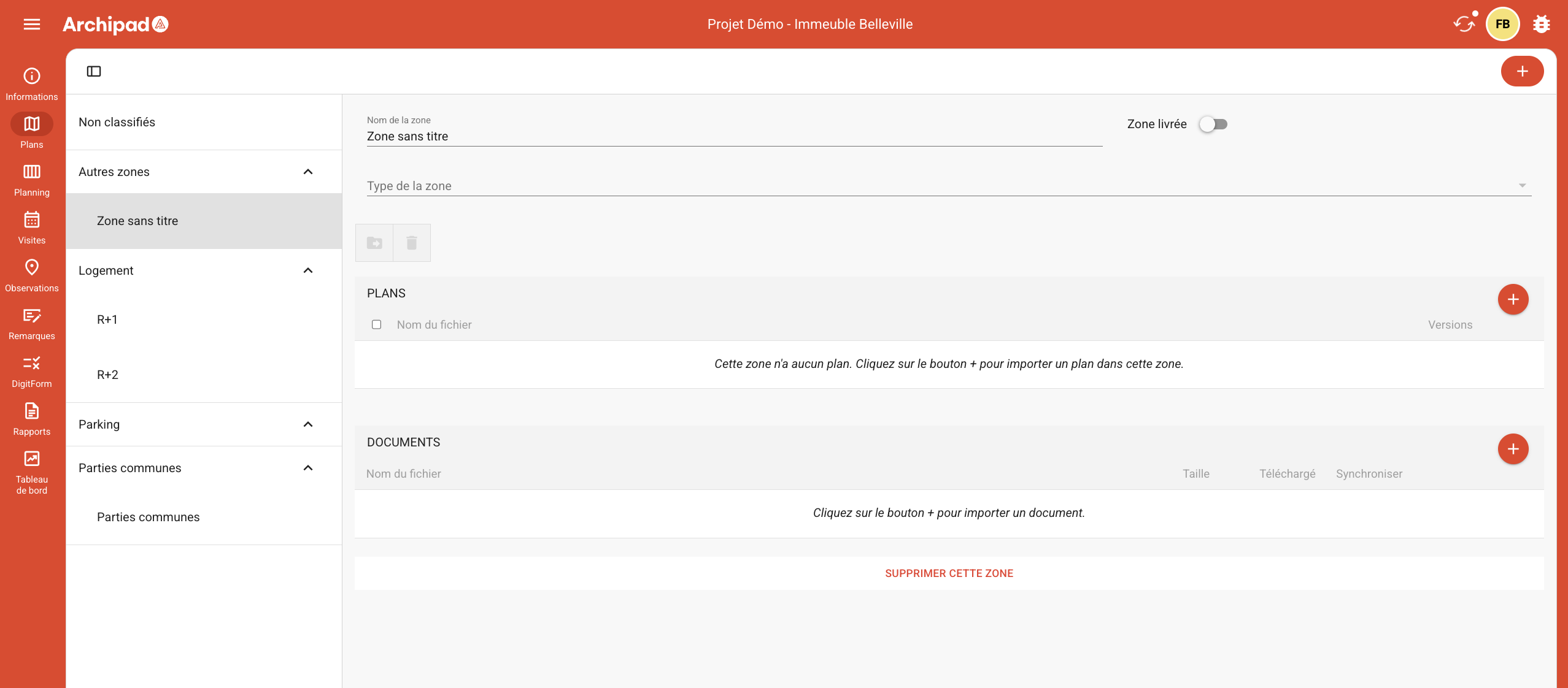 Une zone est un espace permettant de classifier et d'organiser vos plans et documents selon chaque zone créée. Vous pouvez visualiser les zones sur Archipad iOS, mais leur création se fait uniquement sur Archipad Web.